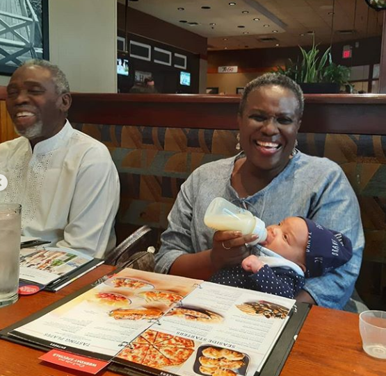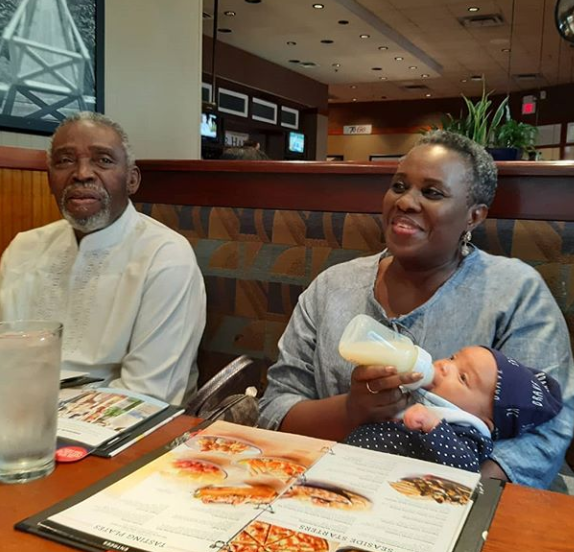 Actress Joke Silva and her hubby, Olu Jacobs, were pictured bonding with their grand daughter, Oluwasoromidayo Atarah Owanemi Abimbola Jacobs. Their son, Olusoji Jacobs and his wife, Boma welcome the bundle of joy in April 2019. The excited grandma shared the adorable photos on her Instagram page with the caption ”I am grateful Lord…thank you”. See more photos below.